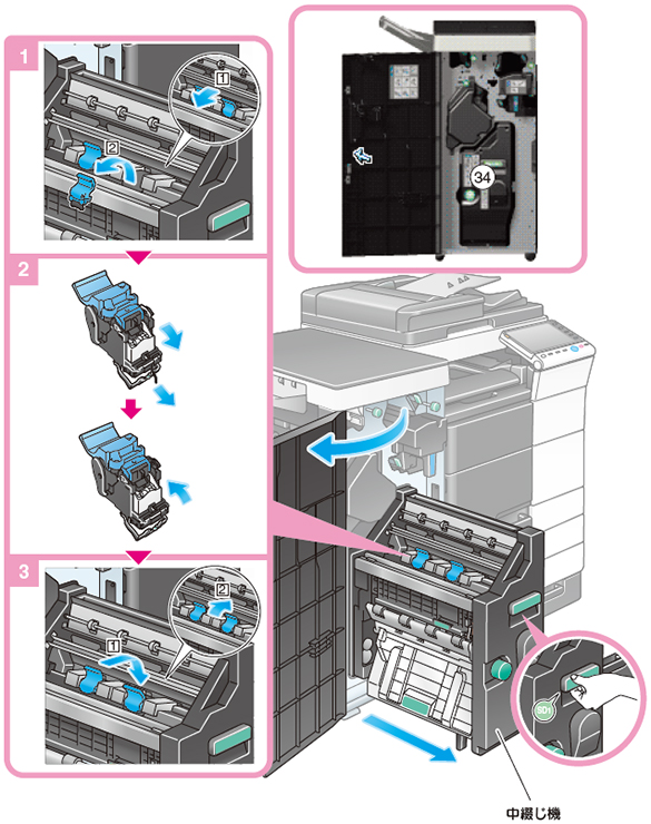 けがをする恐れがありますので、ステープルの針づまり処理にはご注意ください。
