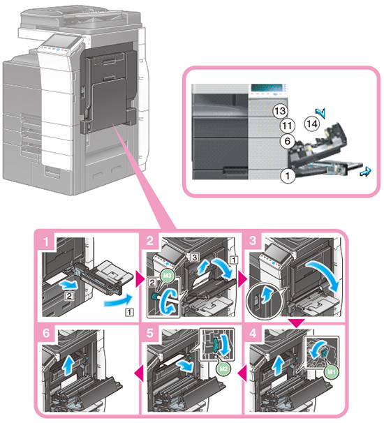 右ドア部を開けて、下図の手順に従って詰まった用紙を取り除いてください。