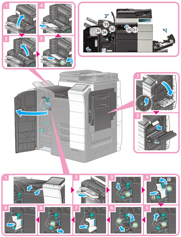 オプションのフィニッシャーFS-534に中綴じ機SD-511、パンチキットPK-520を装着している場合は、下図の手順で詰まった紙を取り除いてください。