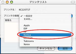 [プリンターの機種]をクリックし、「Konica」を選択します。
