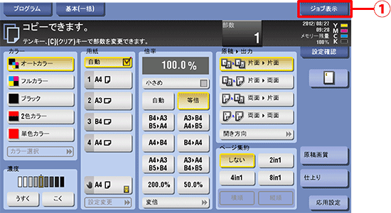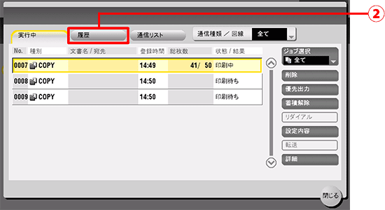 「ジョブ表示」(①)→「履歴」(②)を押すと、確認することができます。