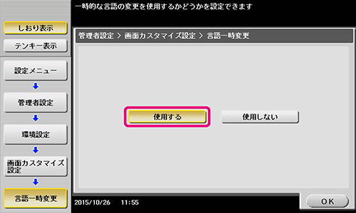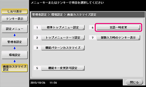 メニュー画面の[設定メニュー]⇒[管理者設定]⇒管理者パスワードを入力して[OK]⇒[環境設定]⇒[次画面]で3/3に移動⇒[画面カスタマイズ設定]⇒[言語一時変更]⇒[使用する]⇒[OK]⇒[閉じる]