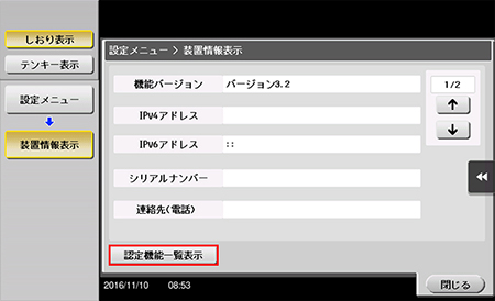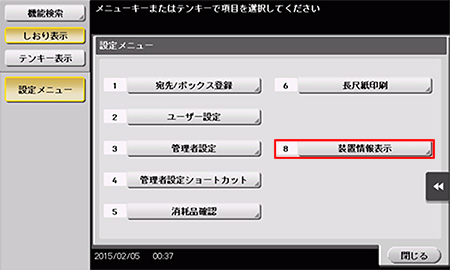 1.トップメニューにて、[設定メニュー]→[装置情報表示]と選択します。
