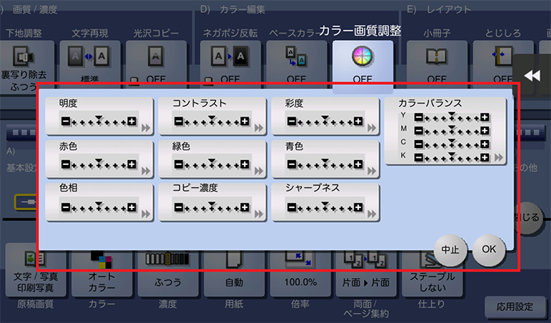 画像調整詳細設定ができます。【カラー編集】→【カラー調整】ボタンを選択して設定します。