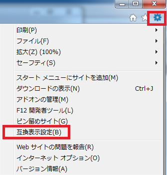 Internet Explorer 右上のメニューから互換表示設定を選択してください。