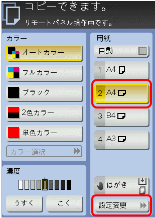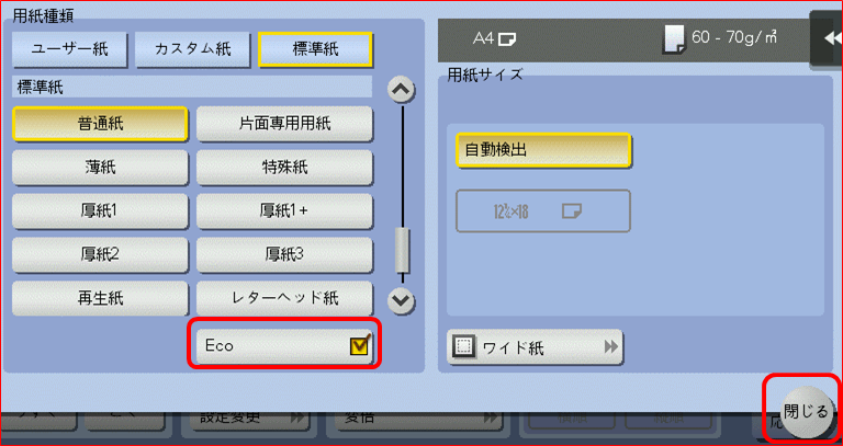 トレイ1~4が順番に優先出力になっている場合でも「ECO」の設定が入っているトレイが優先されます。 ECOのチェックを外していただくとトレイ1から優先出力されます。