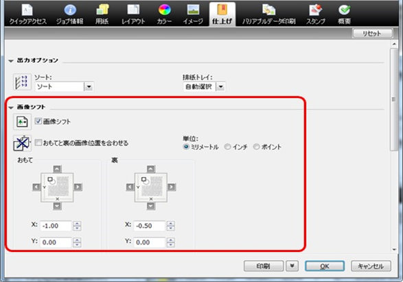 Fiery印刷設定の [プロパティ] → 仕上げタブ内に画像シフト設定の場所があります。