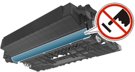 警告—破損の恐れがあります:イメージングユニットの下の光沢のある青いフォトコンダクタードラムには触れないでください。触れると、印刷品質に影響を与えることがあります。