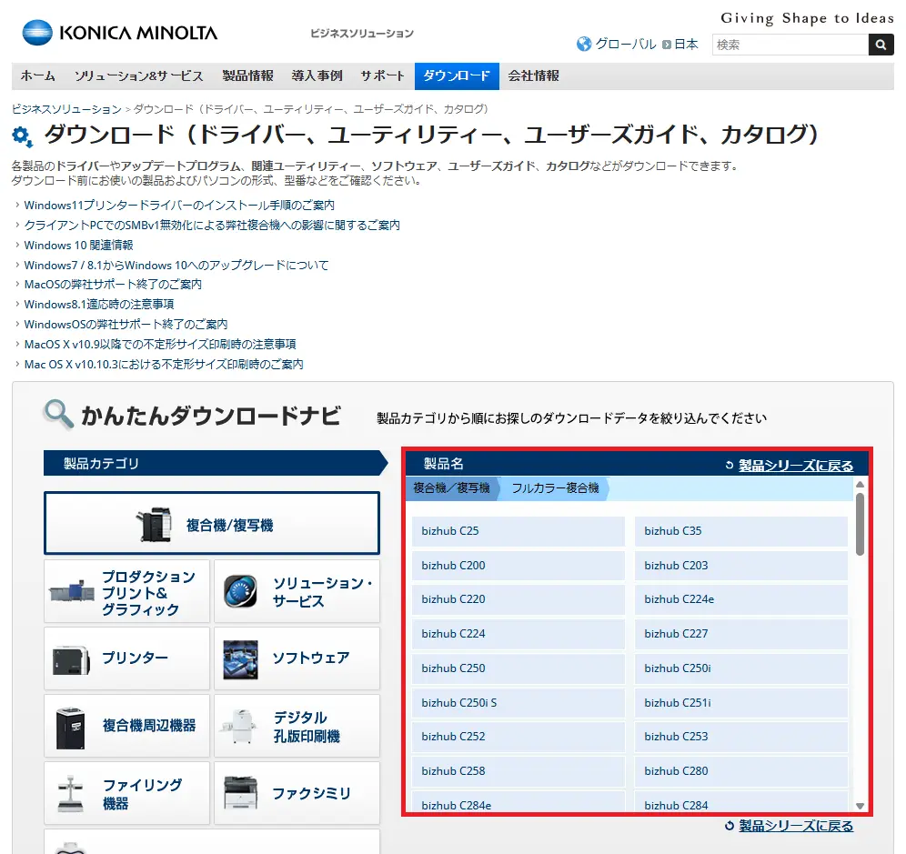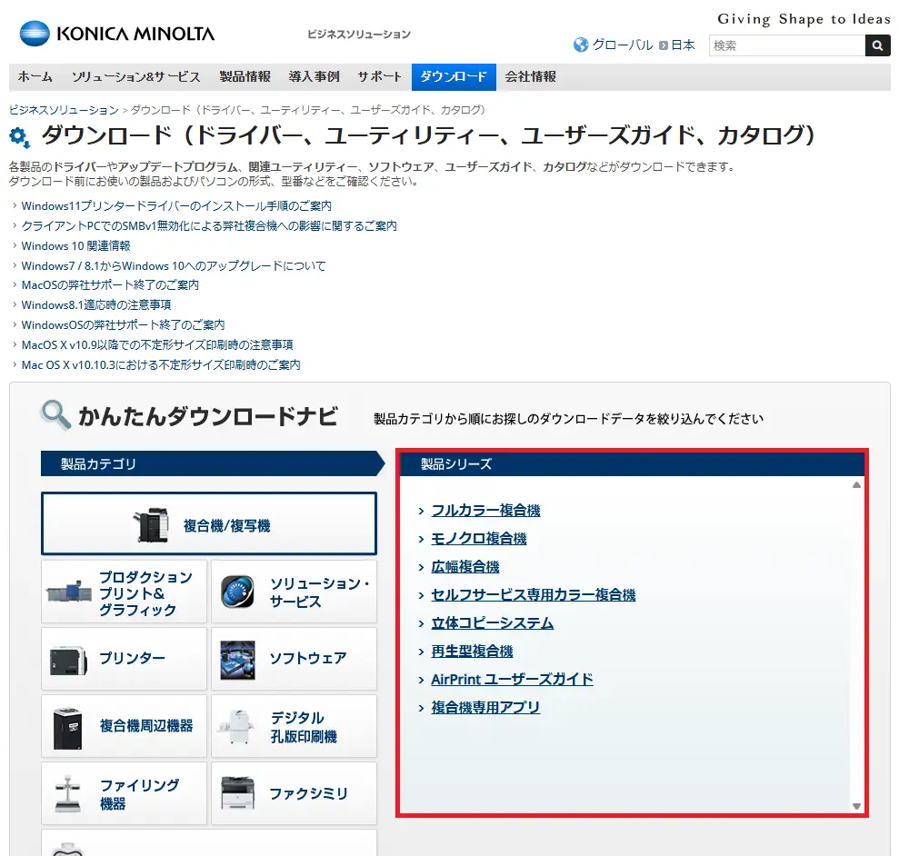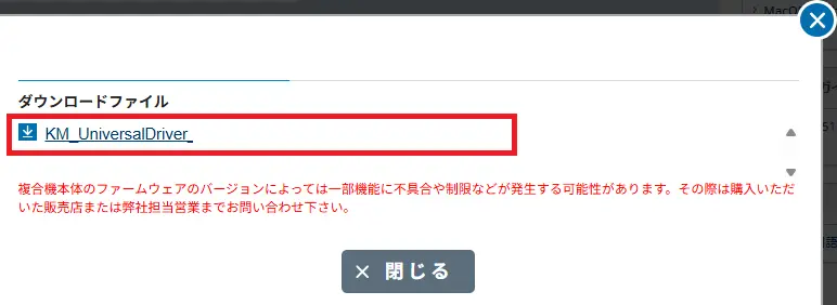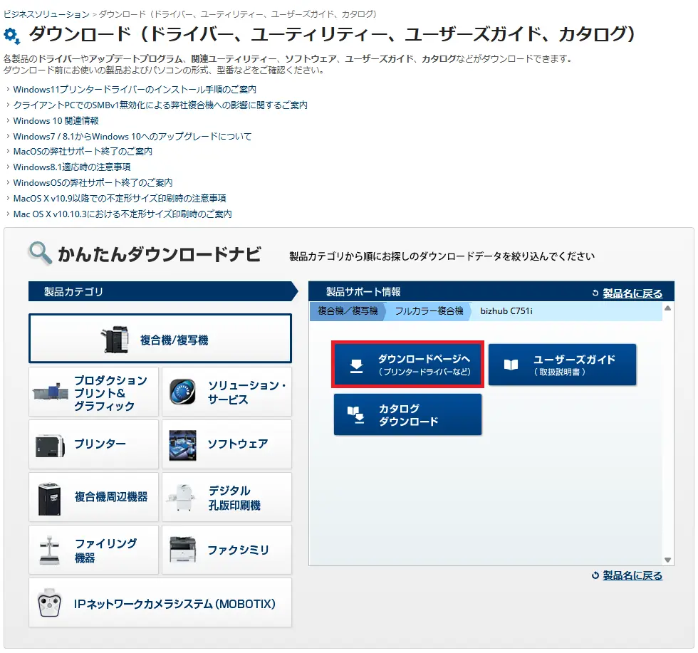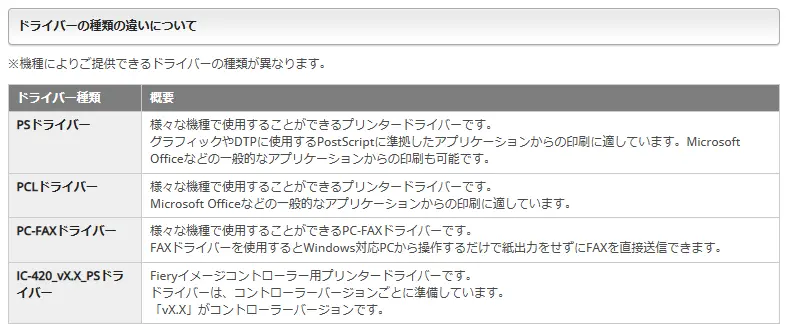 - 以下のURLへアクセスし、プリンタドライバーをダウンロードします。