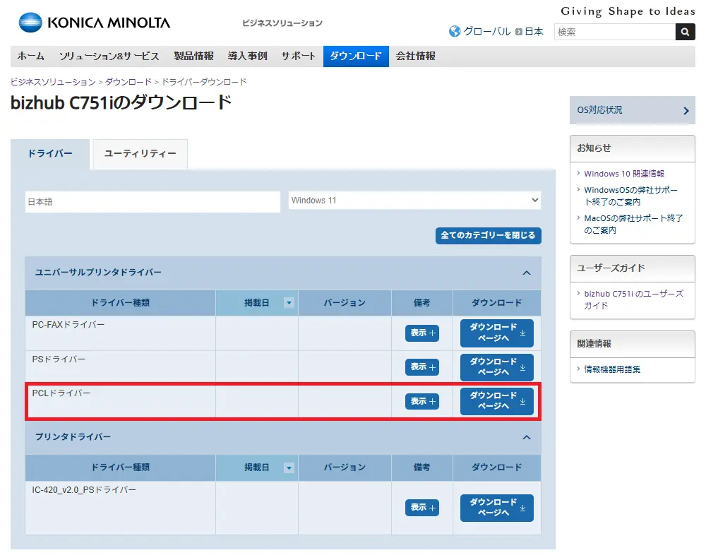 - PCLドライバー欄の「ダウンロードページへ」をクリックし、
