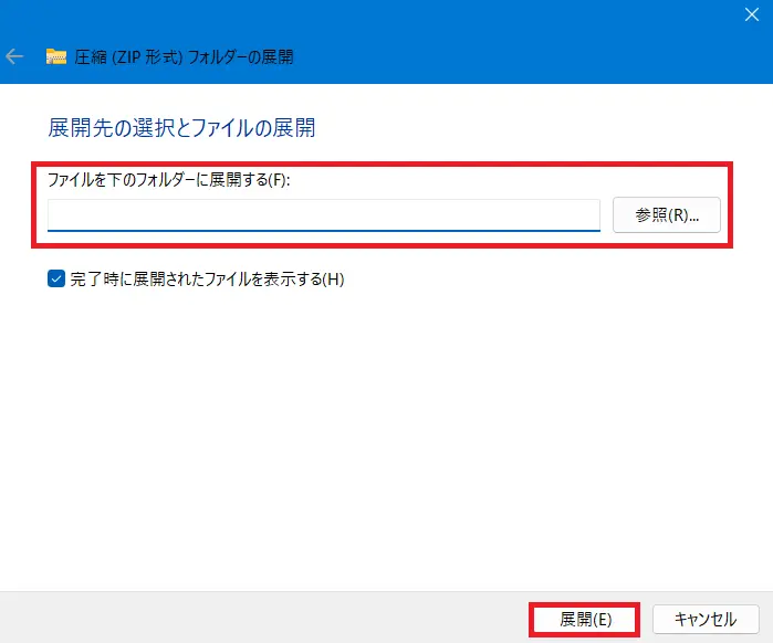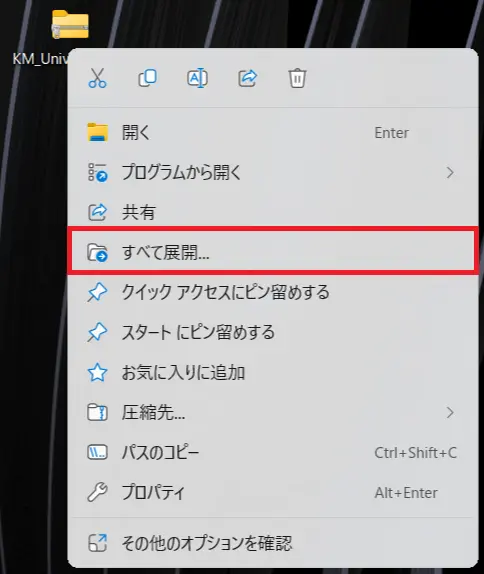 - ダウンロードしたファイルを右クリックし、すべて展開をクリックします。
