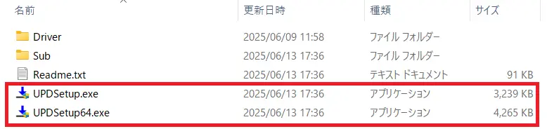 - 展開したフォルダを開き、フォルダー内の[UPDSetup.exe](32ビット環境の場合)または[UPDSetup64.exe](64ビット環境の場合)を実行します。