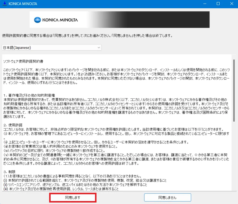 - 以下の使用許諾契約書画面が表示されますので、内容をご確認の上「同意します」をクリックします。