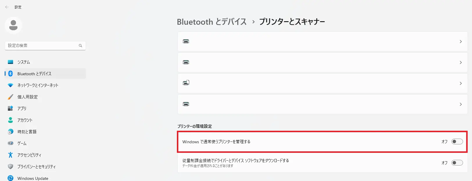 - 「Windowsで通常使うプリンタを管理する」のチェックをオフにします。