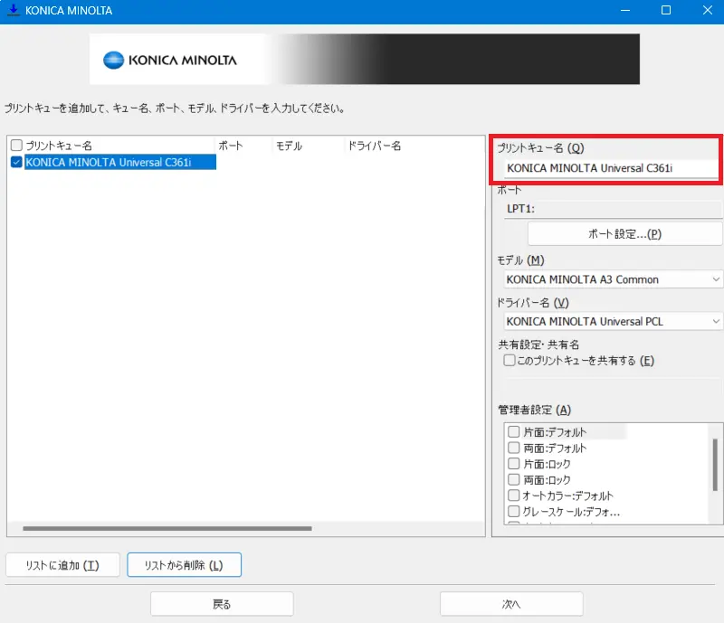 - 右画面の「プリントキュー名」を任意の名前(ご使用の機種名等)に変更します。