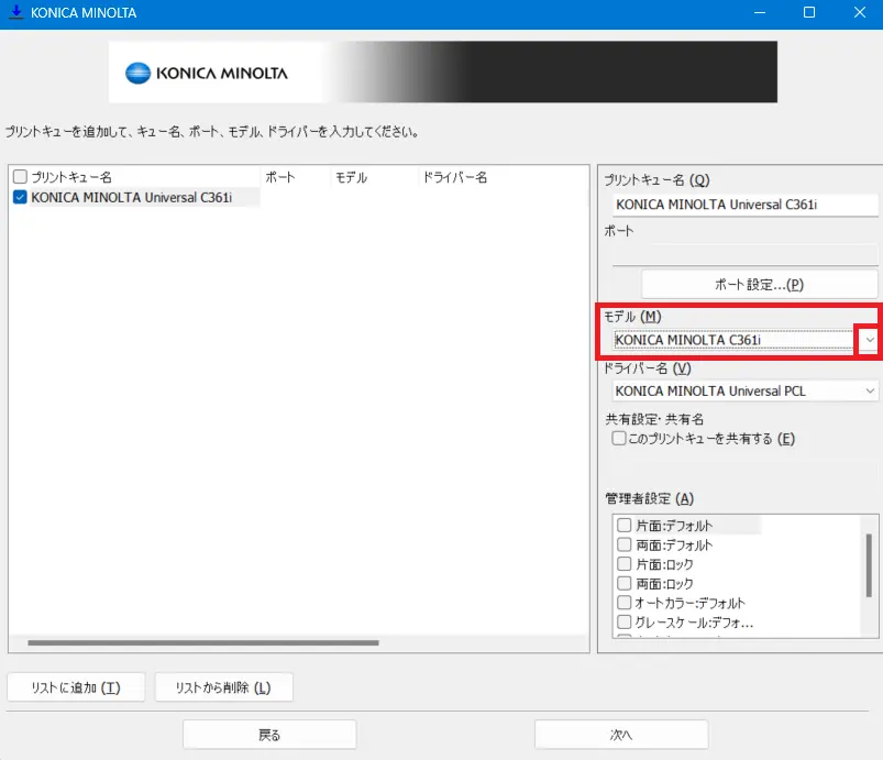 - 右画面の「モデル名」箇所の「∨」をクリックし、ご使用の複合機機種名を選択します。