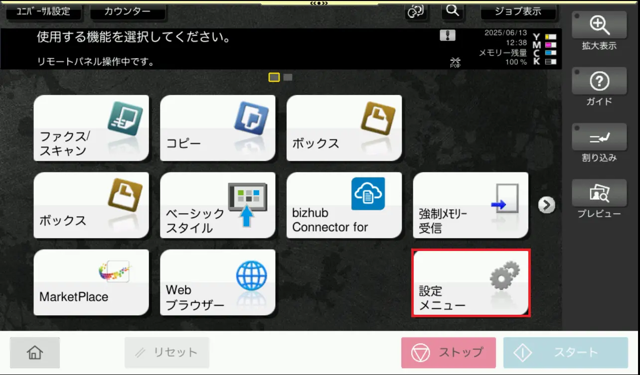 - 複合機操作パネルの「設定メニュー」をタップします。