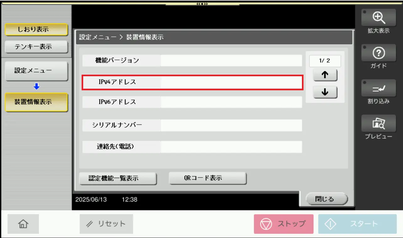 - 複合機のIPアドレスの確認方法はこちらを参照ください。