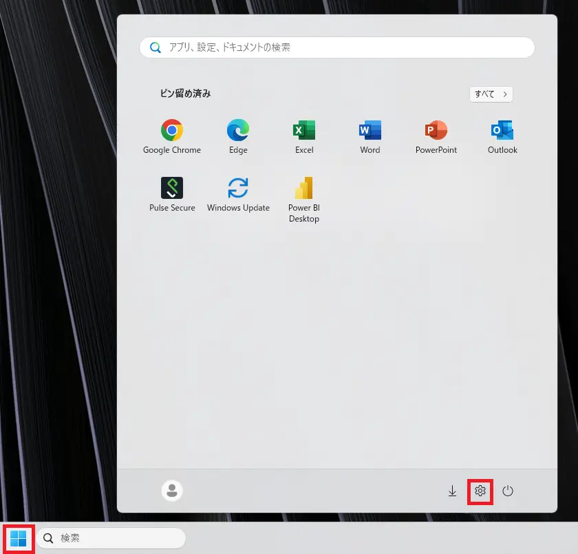 - スタートをクリックし、表示されたメニューから「設定」をクリックします。