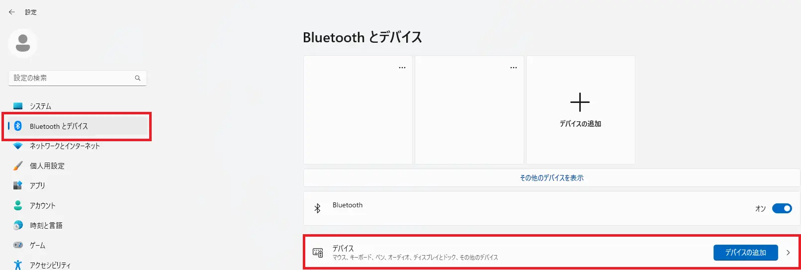 - 画面左側から「Bluetoothとデバイス」をクリックし、表示された一覧から「デバイス」をクリックします。