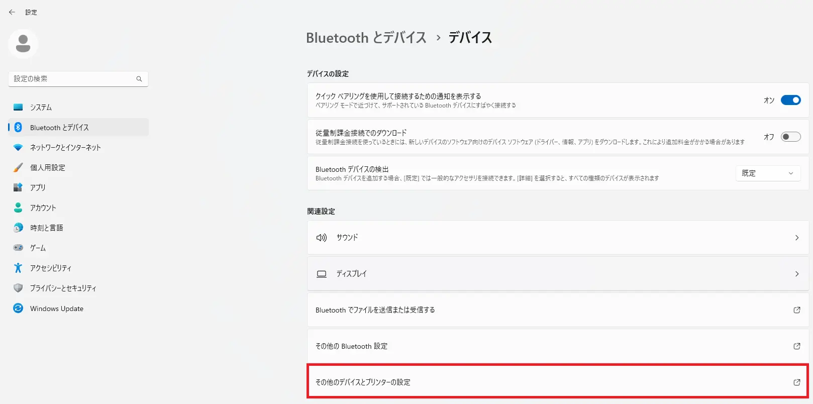 - 「その他のデバイスとプリンターの設定」をクリックします。