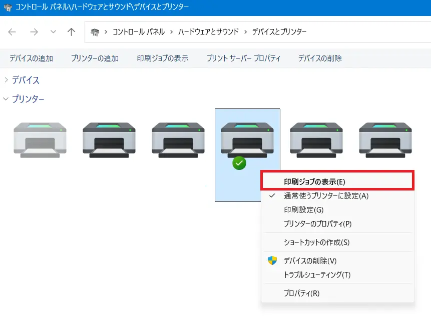 - 使用するプリンターのアイコンを右クリックし、[印刷ジョブの表示]をクリックします。
