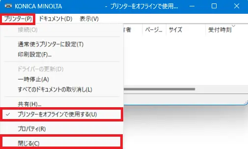 [プリンターをオフラインで使用する]をクリックし、[閉じる]ボタンをクリックします。