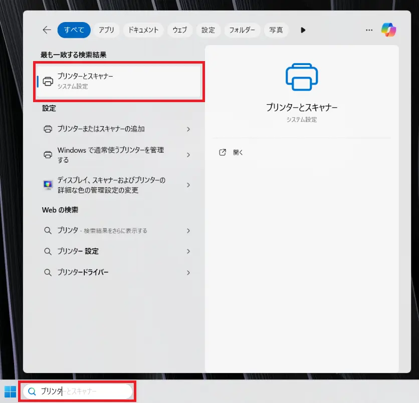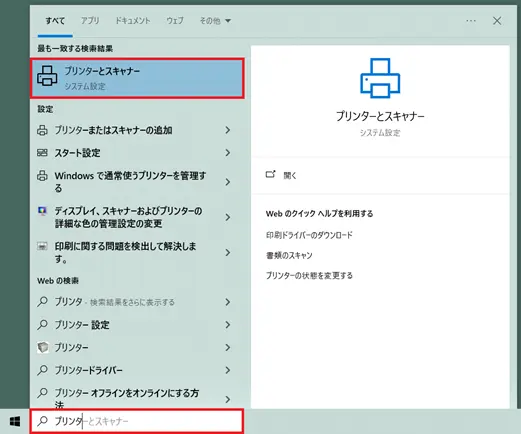 - Windowsの検索窓にプリンタと入力し「プリンターとスキャナー」をクリックします。