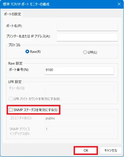- [SNMPステータスを有効にする]のチェックボックスのチェックを外し、[OK]ボタンをクリックします。