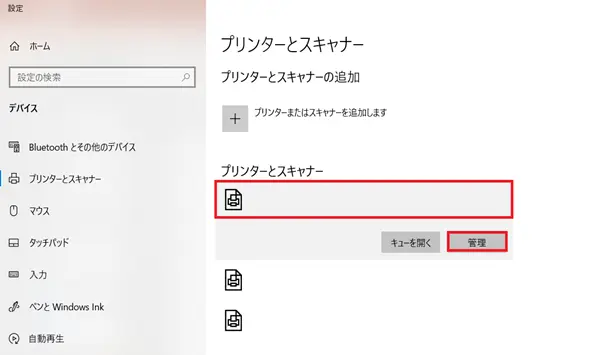 - 使用しているプリンターをクリックし、「管理」をクリックします。