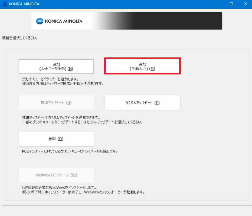 - 「プリンタードライバーインストール時に「プリンター/複合機は見つかりませんでした。」とメッセージが表示された場合の対処方法を教えてください。」は、手動入力手順の「4.」から続きの設定をしてください。