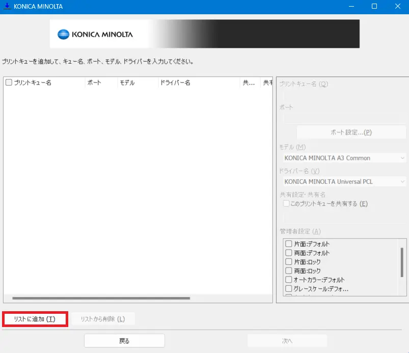 - 右画面の「プリントキュー名」を任意の名前(ご使用の機種名等)に変更します。