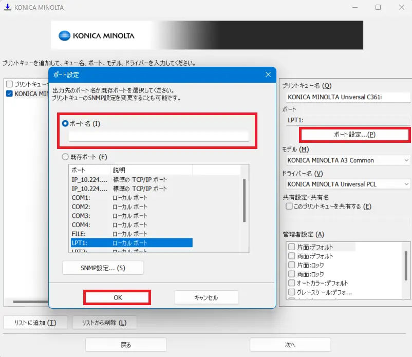 - 右画面の「ポート設定」をクリックします。そしてポート名にチェックを入れ、