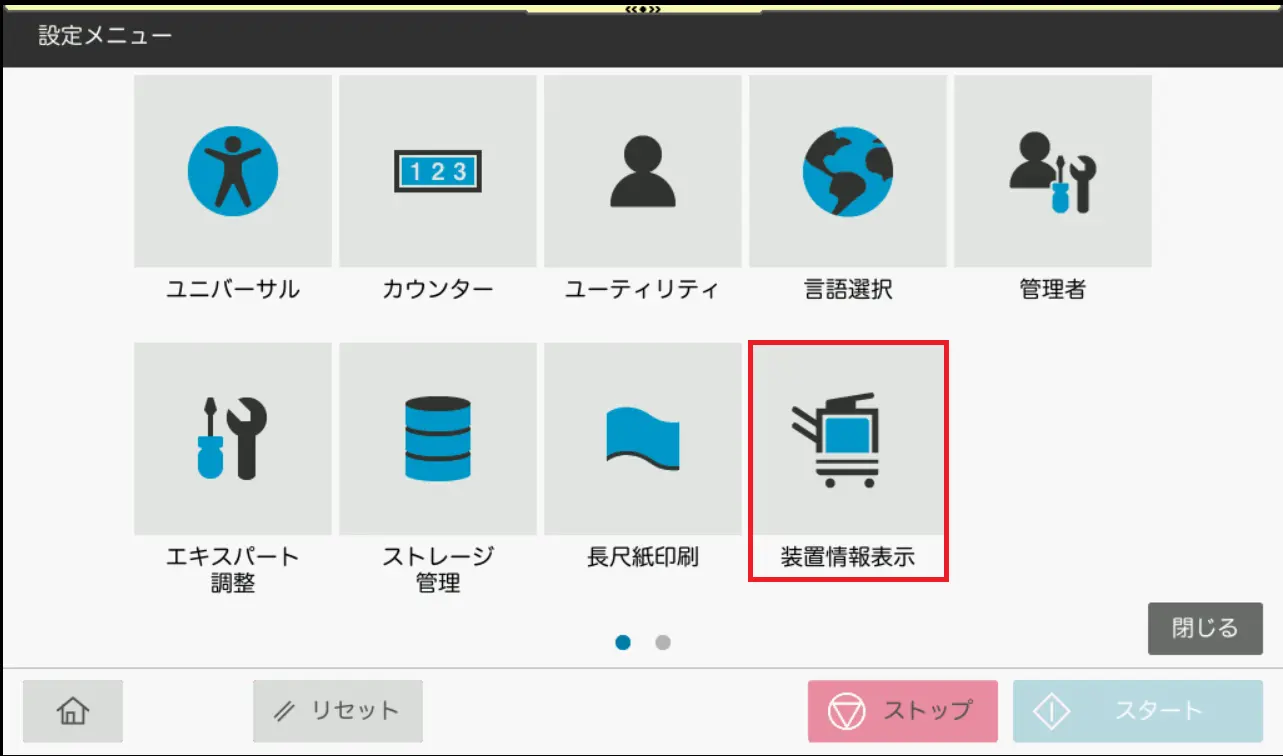 - 複合機操作パネルの「装置情報表示」をタップします。