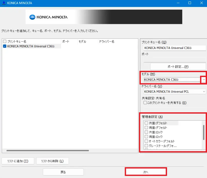 - 必要に応じ「管理者設定」の初期値にチェックを入れて「次へ」をクリックしてお進みください。