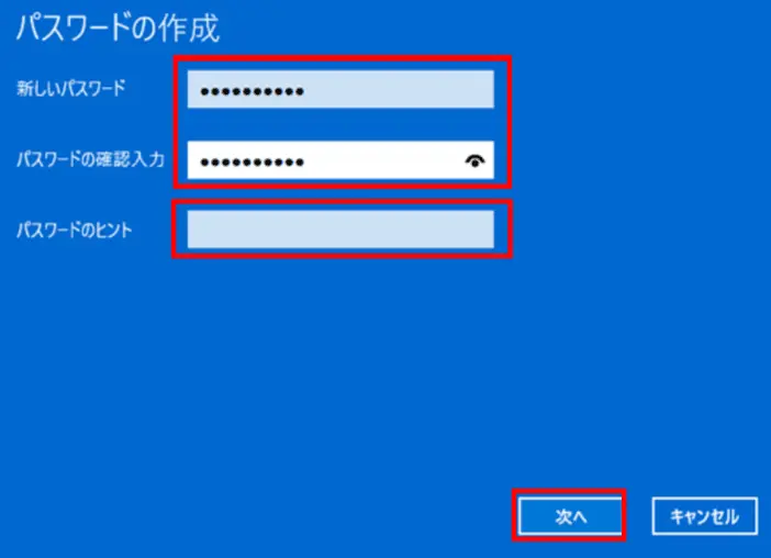[パスワードのヒント]欄には、設定するパスワードのヒントを入力します。