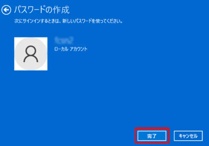 - [完了]ボタンを押し、ユーザーアカウントのパスワード設定は終了となります。