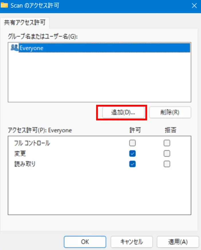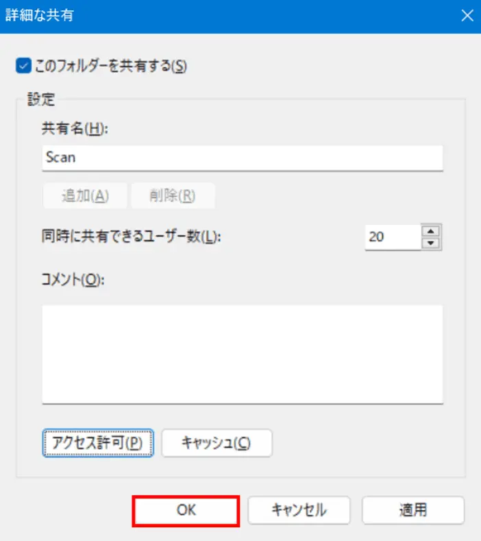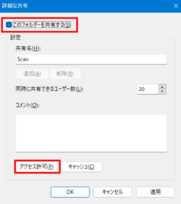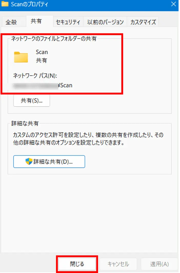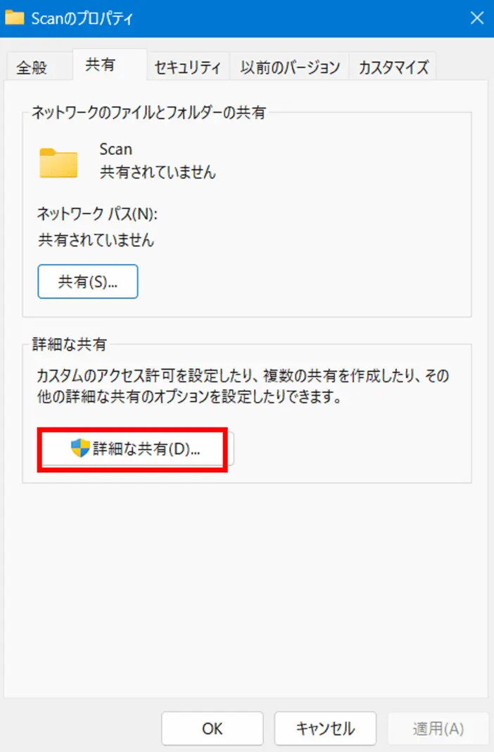 - [Scanのプロパティ]ダイアログが表示されますので、上部[共有]タブを押し、[詳細な共有]ボタンを押します。