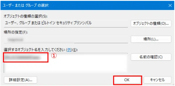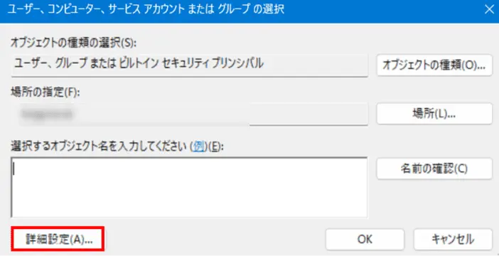 - [ユーザーまたはグループの選択]画面で[詳細設定]を押します。