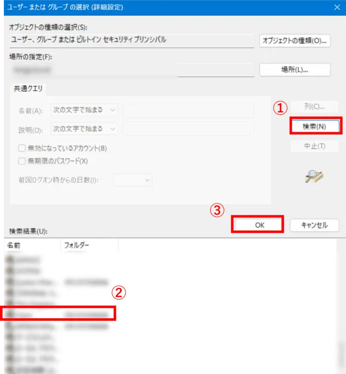 - [検索]を押すと(①)検索結果が表示されますので、その中から自分の使用しているユーザー名を検索結果欄の中から選択し(②)、[OK]を押します。(③)