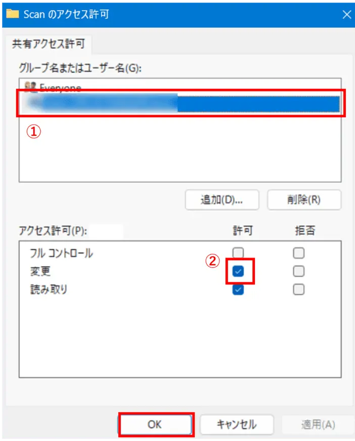 - 追加された自分の使用しているユーザーアカウント名をクリックし(①)、[許可]の[変更]にチェックマークを付け(②)、