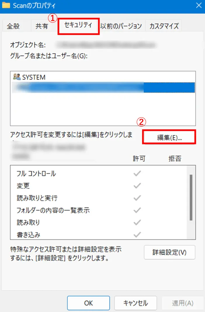 - Scanのプロパティ画面の[セキュリティ]タブを押し(①)、[編集]を押します。(②)