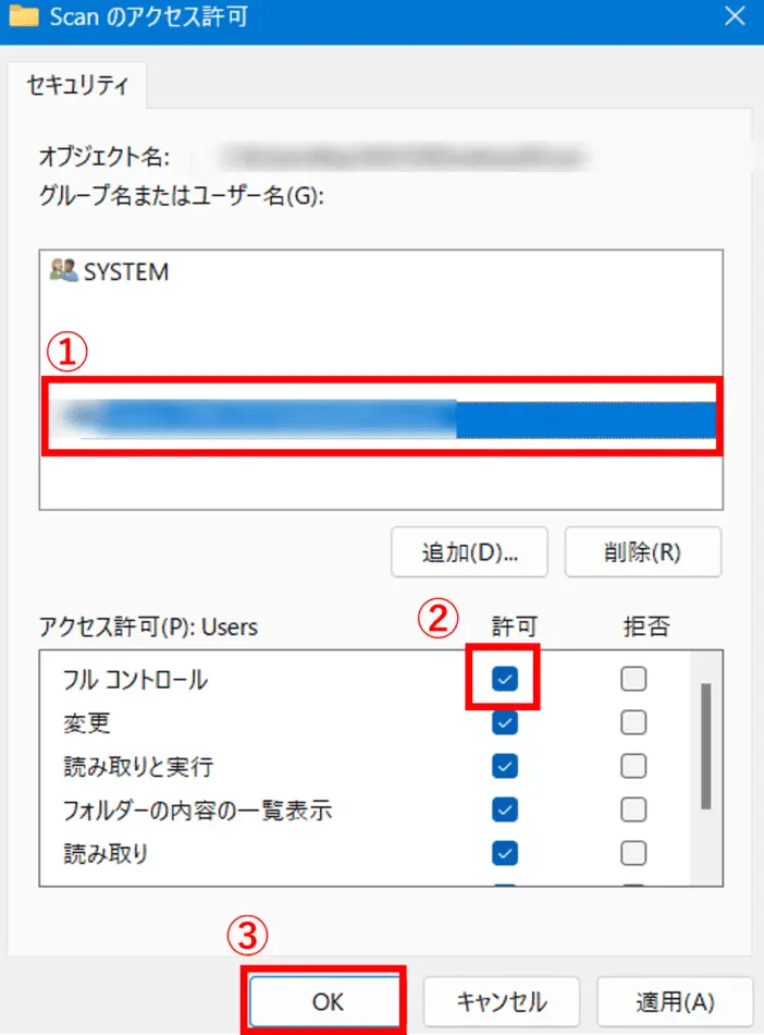- 自分のユーザーアカウントを選択し(①)、[許可]の[フルコントロール]にチェックを入れ(②)、[OK]を押します。(③)
