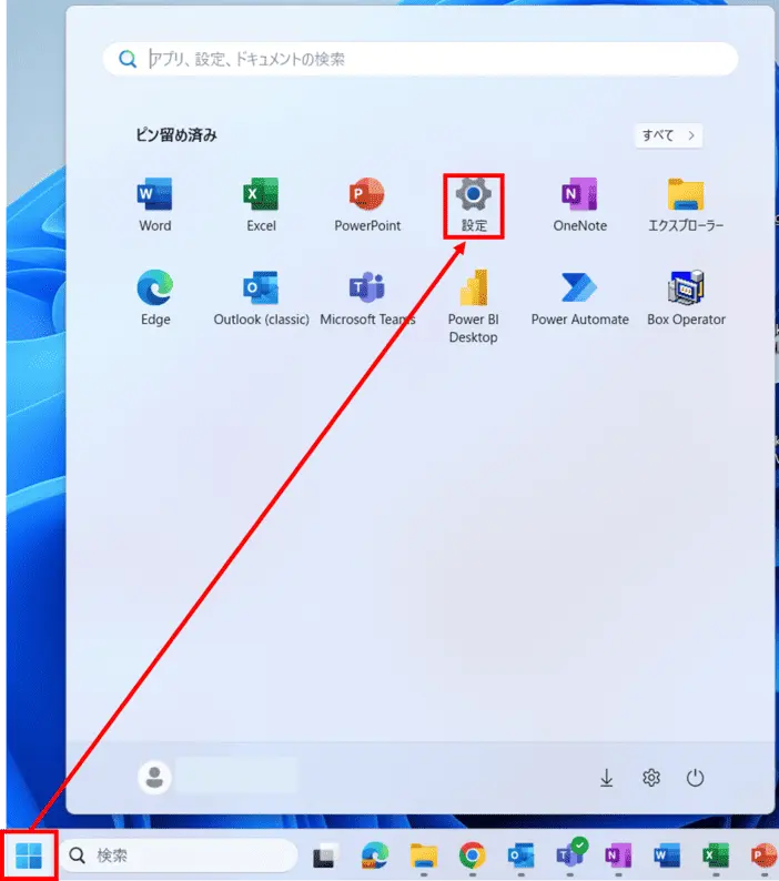 - [スタート]ボタンを押し、表示されたメニューから[設定]ボタンを押します。