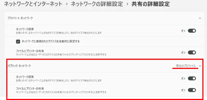 - [現在のプロファイル]と表記されたネットワーク欄の[ネットワーク探索]と[ファイルとプリンターの共有]をオンにします。