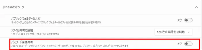 - [すべてのネットワーク]欄の[パスワード保護共有]をオフにします。