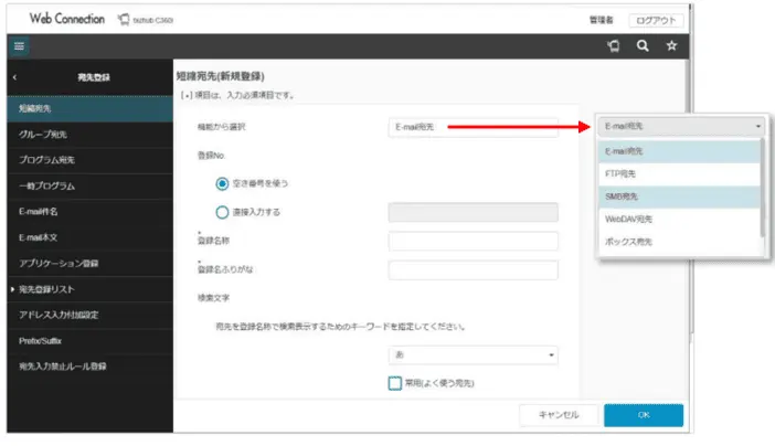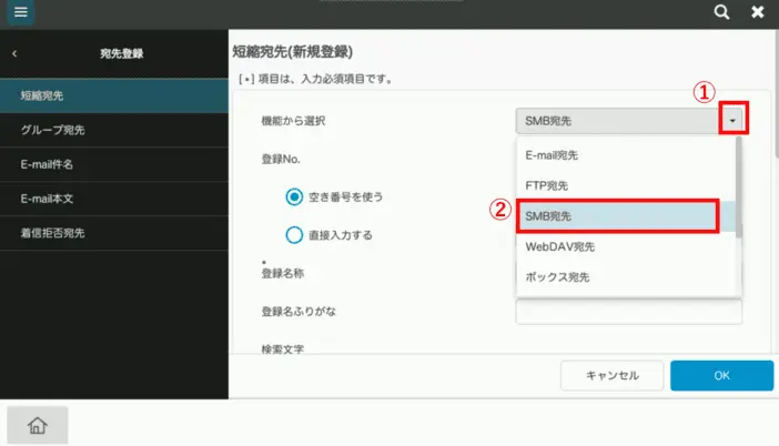 - [機能から選択]で「▼」を押し、[SMB宛先]を選択します。