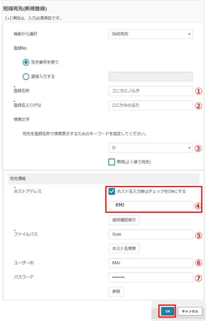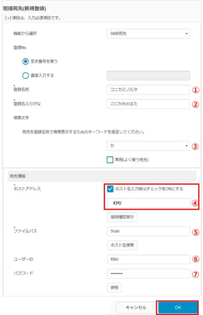 ⑤ファイルパス:2.共有フォルダー設定で作成した共有フォルダーの名称を入力します。今回の設定では「Scan」を入力。