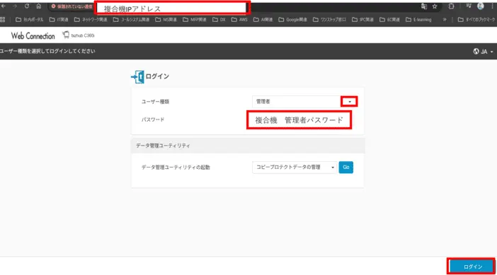 ユーザー種別の「▼」を押し、[管理者]を選択し、設定された管理者パスワードを入力して[ログイン]ボタンを押します。
