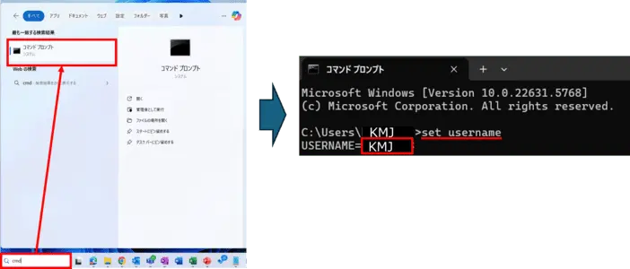 ①タスクバーの虫眼鏡アイコンを選択し、検索窓に[cmd]と入力します。コマンドプロンプトが表示されますので押します。